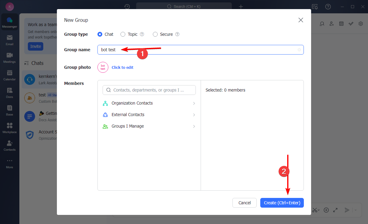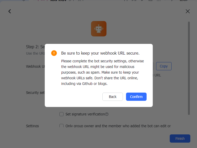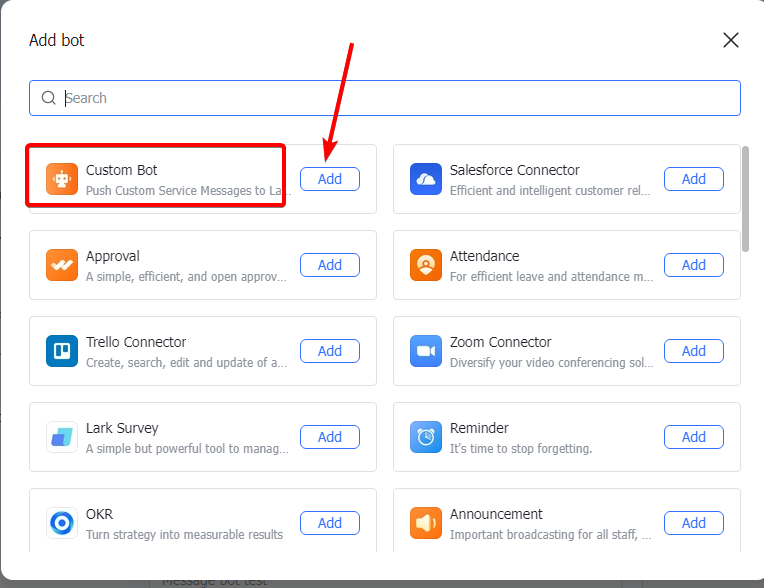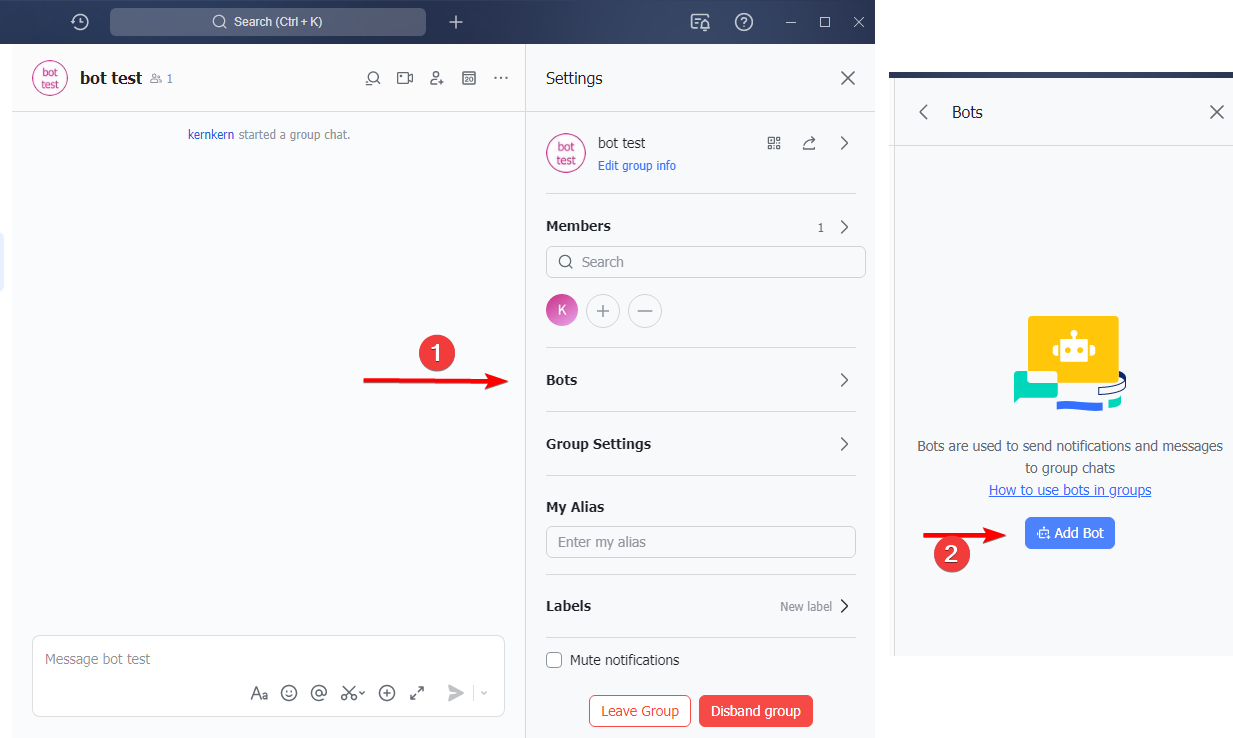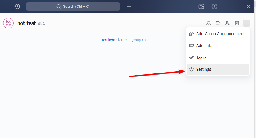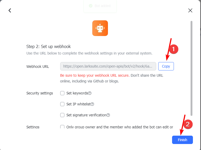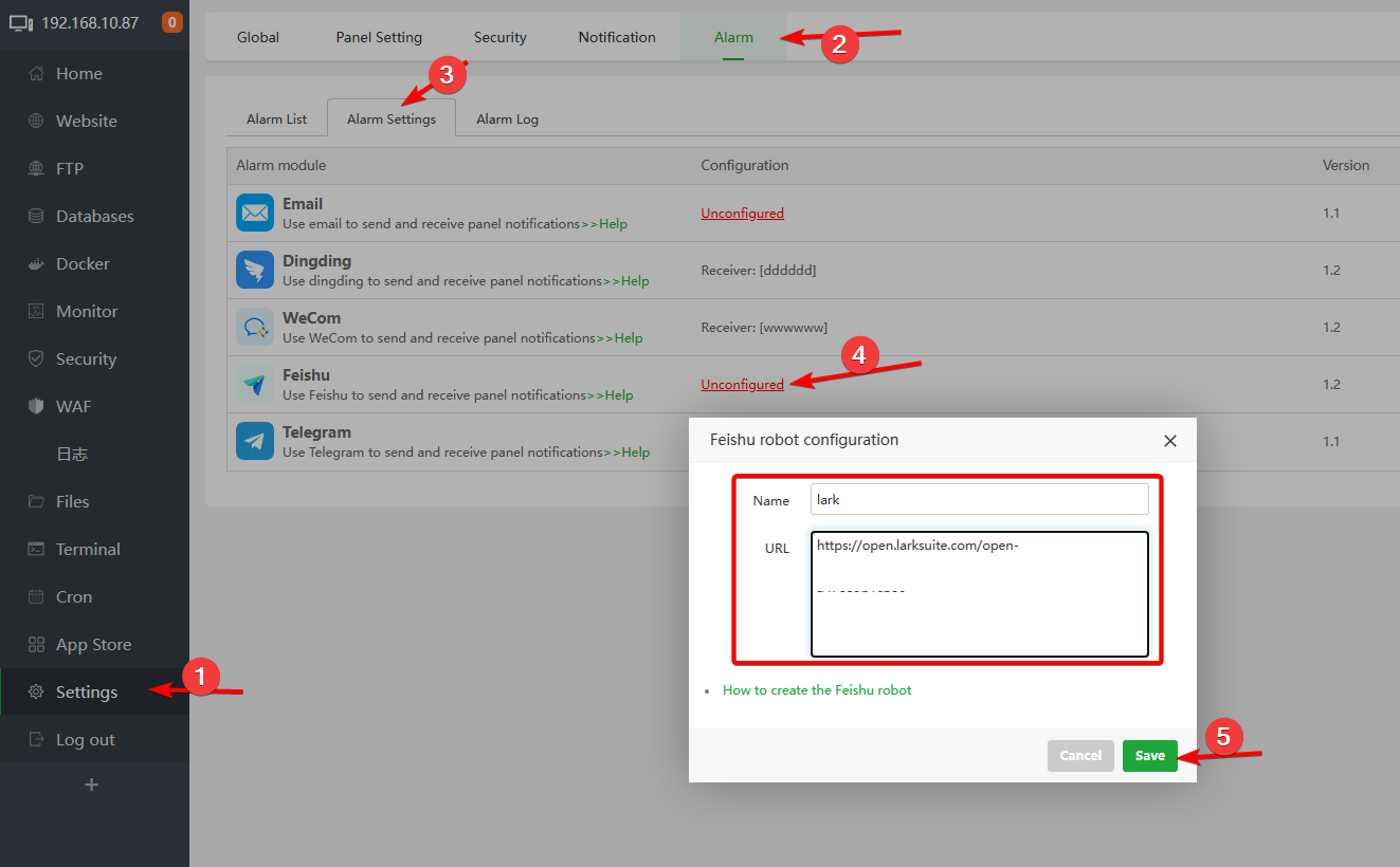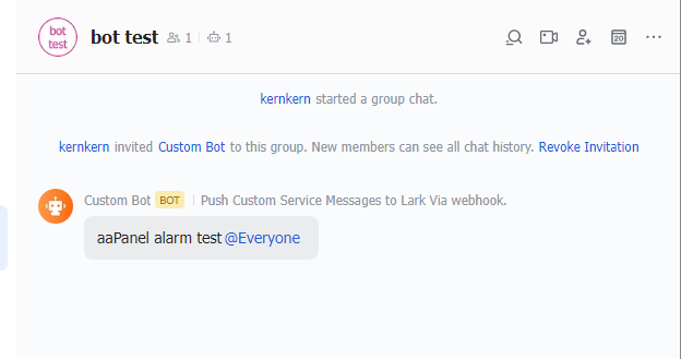 aaPanel_Kern Download and install Lark or Feishu If you do not have an account, please follow the prompts to register https://www.larksuite.com/ Create group Add Bot Enter Group Chat --> Settings Bot Custom Bot Click "Copy" to copy the link Paste the link you just copied into the URL box of "Feishu" and click "Save" You will then receive a test message