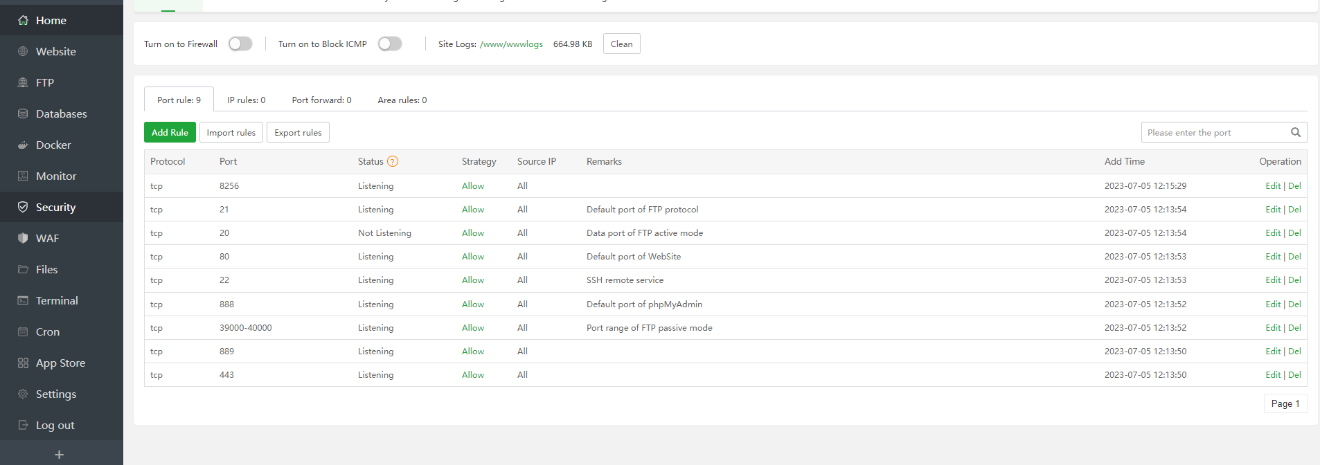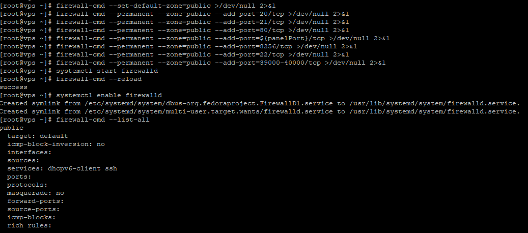 aaPanel_Kern aaP_tangdinhvu use ssh add rule firewalld: panelPort=7800 sshPort=22 firewall-cmd --set-default-zone=public >/dev/null 2>&1 firewall-cmd --permanent --zone=public --add-port=20/tcp >/dev/null 2>&1 firewall-cmd --permanent --zone=public --add-port=21/tcp >/dev/null 2>&1 firewall-cmd --permanent --zone=public --add-port=80/tcp >/dev/null 2>&1 firewall-cmd --permanent --zone=public --add-port=${panelPort}/tcp >/dev/null 2>&1 firewall-cmd --permanent --zone=public --add-port=${sshPort}/tcp >/dev/null 2>&1 firewall-cmd --permanent --zone=public --add-port=39000-40000/tcp >/dev/null 2>&1 systemctl start firewalld firewall-cmd --reload systemctl enable firewalld firewall-cmd --list-all