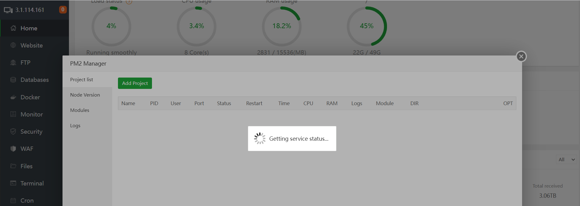 In ubuntu , pm2 is taking too long to map projects everytime i open pm2 management template. and from yesterday its not showing any project at all its gets stuck in getting service status and than after 10min load nothing. But all projects are running in background and i cannot access it from ssh too.