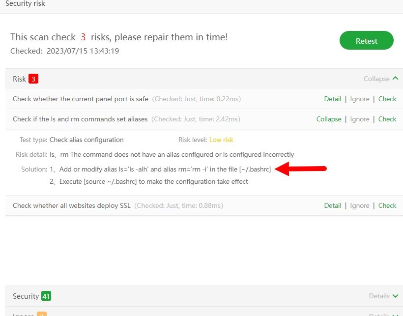 aaPanel_Kern After update to aaPanel 6.8.29, I add this warning too and I modified ~/.bashrc as asked, but the risk warning was still there. So, reading you comment, I modified /root/.bashrc too and it worked. So, maybe you should modify the text of the expressed solution indicating to apply the change in both bashrc about root and current users.