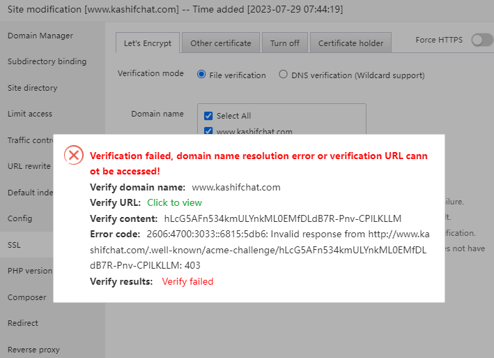 aaPanel_Kern kashifchatzone Hello, whether to use CDN, reverse proxy. If used, please use dns verification