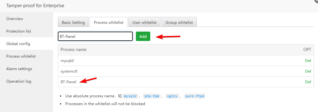 When adding, be sure to fill in the absolute process name, such as the process of the panel: BT-Panel