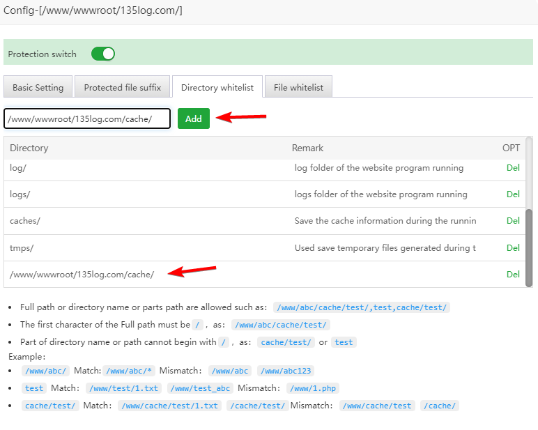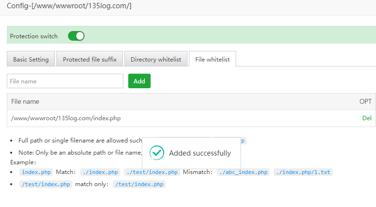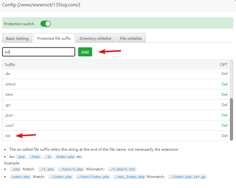 There are Protection switch, Basic Setting, Protected file suffix, Directory whitelist, File whitelist for the protected directory