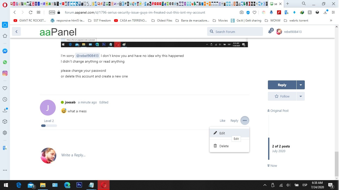 see? it allows me to edit a post from my real account while still showing me the option to reply as @rebel908413