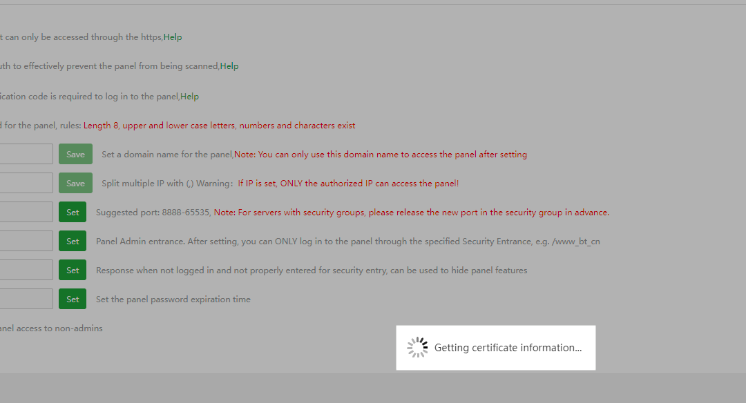 aaP_johnjameskane aaPanel_Kern I am getting this same issue. browser is chrome Have tried restarting the panel, tried using the fix feature. I have logged out and logged back in not sure what I am doing wrong but it just hangs with the "Getting certificate information..." message. If I click anywhere on the page the message disappears and the Panel SSL is green but if I refresh it is back to grey