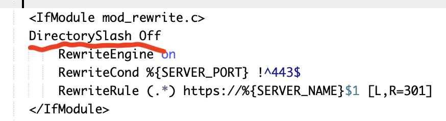 i tired to add this line DirectorySlash Off but it is not working , any suggestion how to turn off this ?