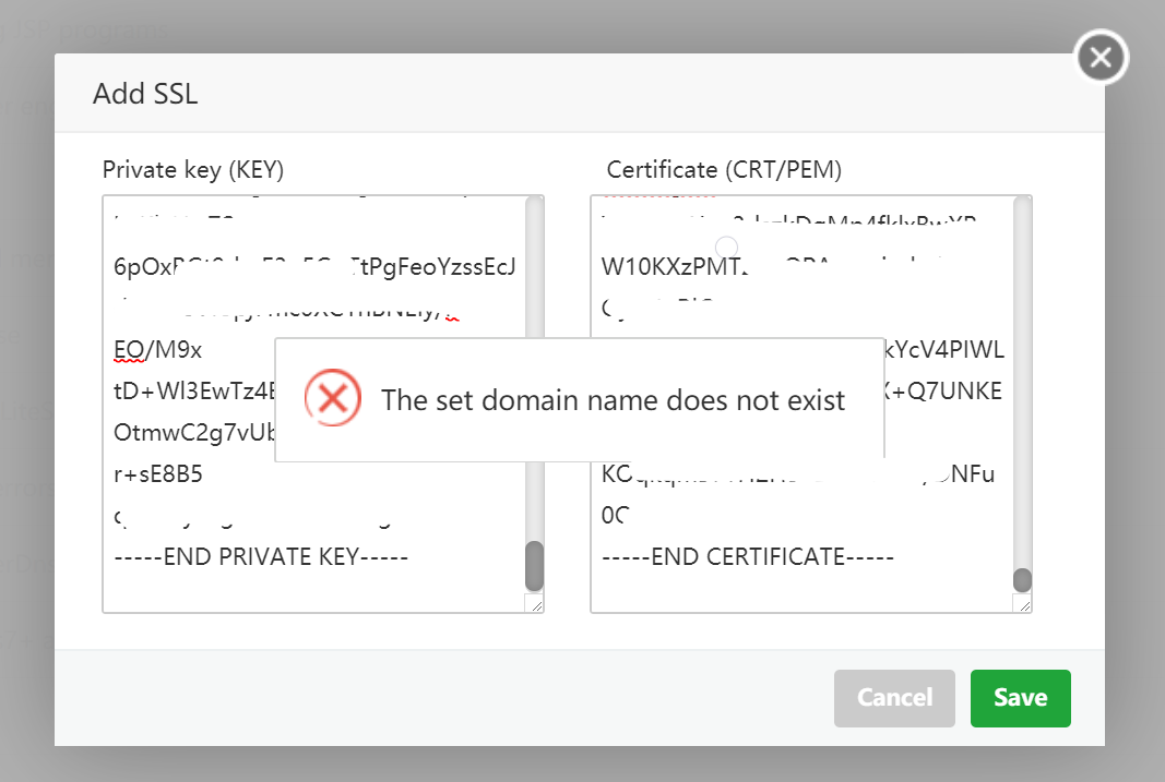 Chorroverde Ok, so i decided to uninstall Mail server and did everything from scratch, now a new problem arise when trying to add SSL certificate to the domain on mail, here is the screenshot. Everything looks good on the mailserver Cant add SSL Certificate.