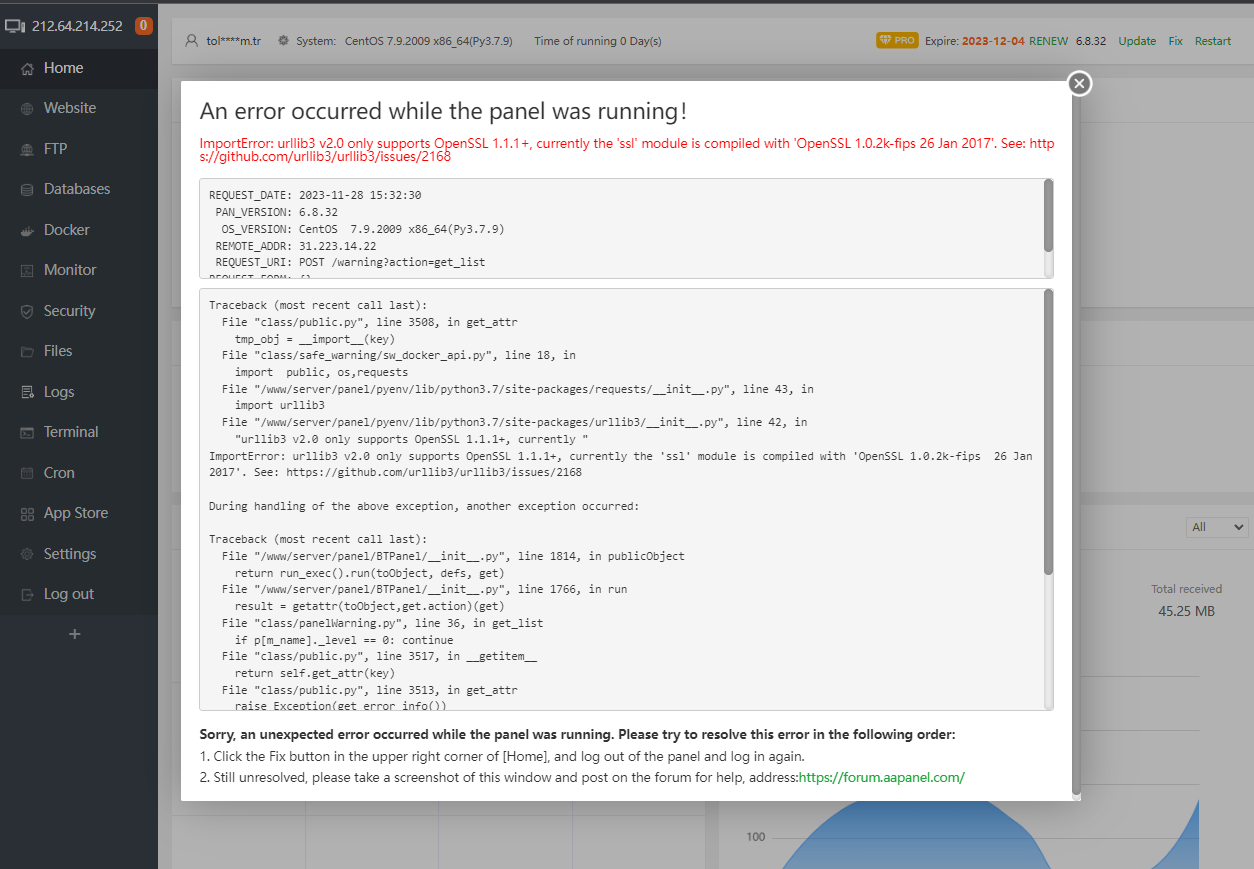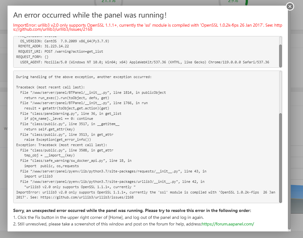 aaPanel_Kern th3ken Hello, use the ssh tool to log in to the server and execute the command btpip install -I requests==2.27 bt restart
