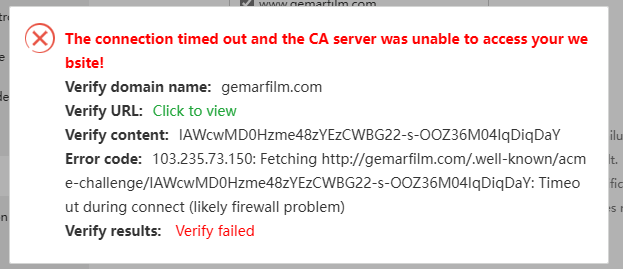 aaPanel_Kern Hello, the SSL provider cannot connect to your server. Is it possible to try to use DNS to verify? aaP_idfernn