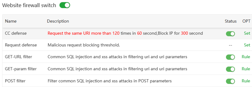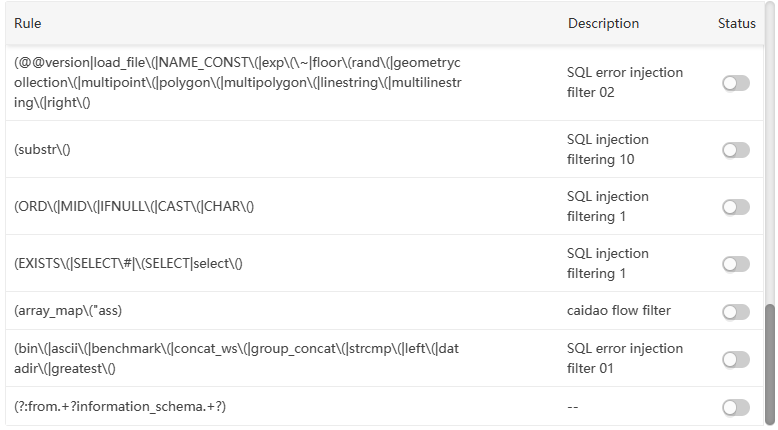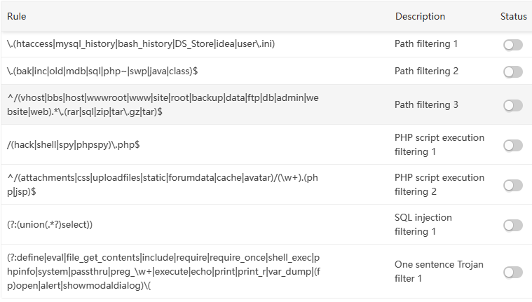 baobao aaPanel_Kern I'm going to collapse. I tried to close all the rules, but it still shows a 500 error. Only after closing the post filter and the two get filter options can it work normally. When the post filter and the two get filter options are turned on, even if all the rules are closed, the error is still 500.