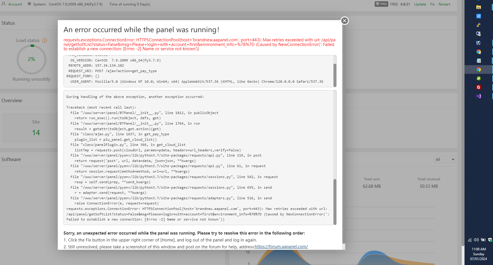 requests.exceptions.ConnectionError: HTTPSConnectionPool(host='brandnew.aapanel.com', port=443): Max retries exceeded with url: /api/panel/getSoftList?status=False&msg=Please+login+with+account+first&environment_info=%7B%7D (Caused by NewConnectionError(': Failed to establish a new connection: [Errno -2] Name or service not known'))