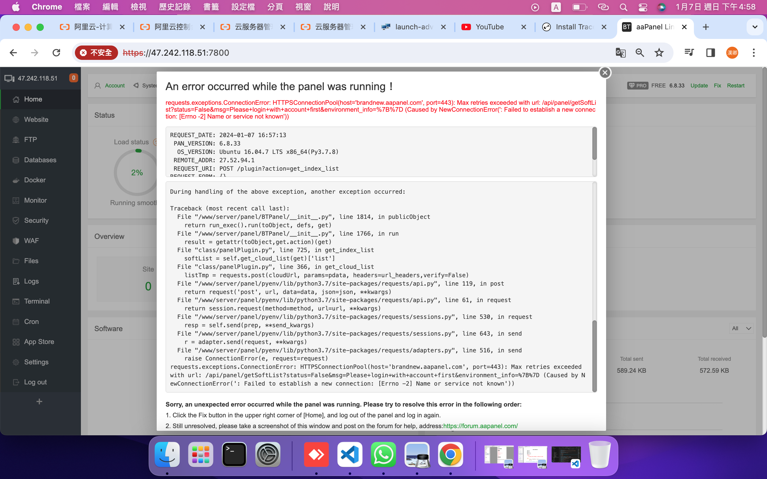 requests.exceptions.ConnectionError: HTTPSConnectionPool(host='brandnew.aapanel.com', port=443): Max retries exceeded with url: /api/panel/getSoftList?status=False&msg=Please+login+with+account+first&environment_info=%7B%7D (Caused by NewConnectionError(': Failed to establish a new connection: [Errno -2] Name or service not known'))