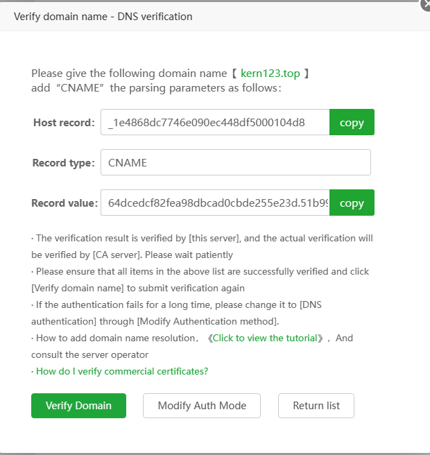 For the record value, select CNAME and enter the verification information for this validation. Make sure to add ".yourdomain.com" at the end of the record. For example, .kern123.top