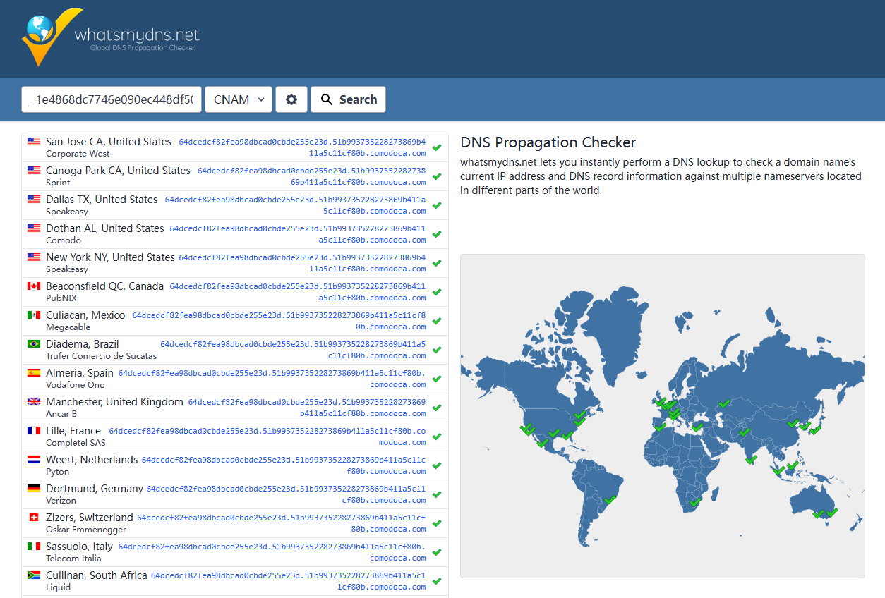 Note: As long as most regions display a green checkmark, it indicates that the CNAME resolution is functioning correctly. You can proceed to wait for the certificate to be issued. However, if all regions show a red X, please check if the CNAME is correctly resolved and ensure there are no typographical errors. Sometimes, certain domain registrars may take a little longer to propagate changes. Wait a few more minutes and try again.