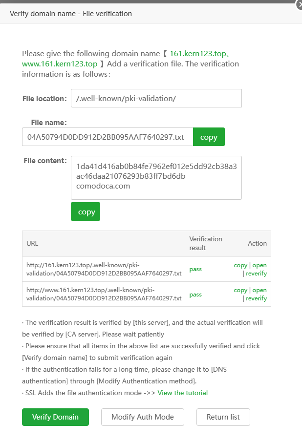 - If you have chosen file validation, the access is confirmed, but the certificate issuance is still delayed for a long time, the reason may be due to 301/302/307 redirects, reverse proxies, forced HTTPS, CDN, or other settings on your website. The CA needs to access your server, so these settings need to be disabled.