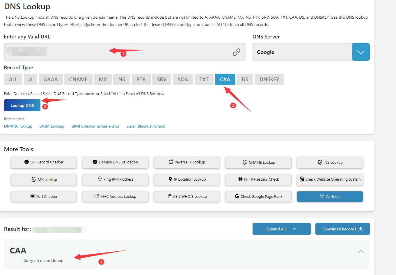 How to check if CAA records exist: Visit this website, enter the domain name, select CAA to check