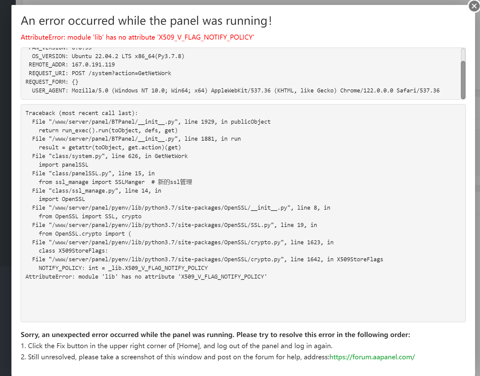 aaPanel_Kern Hello, is it normal to use the ssh tool to execute the command and try again? mv /www/server/panel/pyenv/lib/python3.7/site-packages/OpenSSL /tmp/OpenSSL_bak btpip install pyOpenSSL -I bt reload iPavoReal