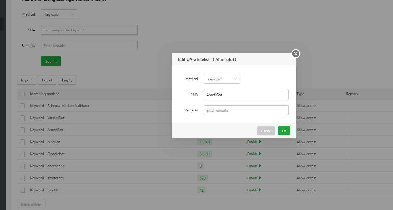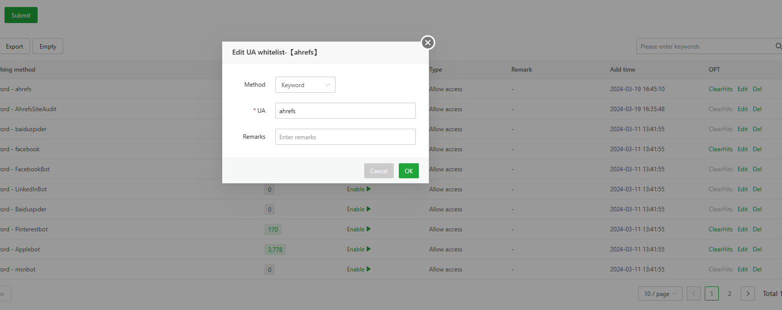 aaPanel_Kern Hello. Please check whether there are hits. If not, it means that the set UA is incorrect. It is also recommended to check the website's logs and add troubleshooting based on the website logs.
