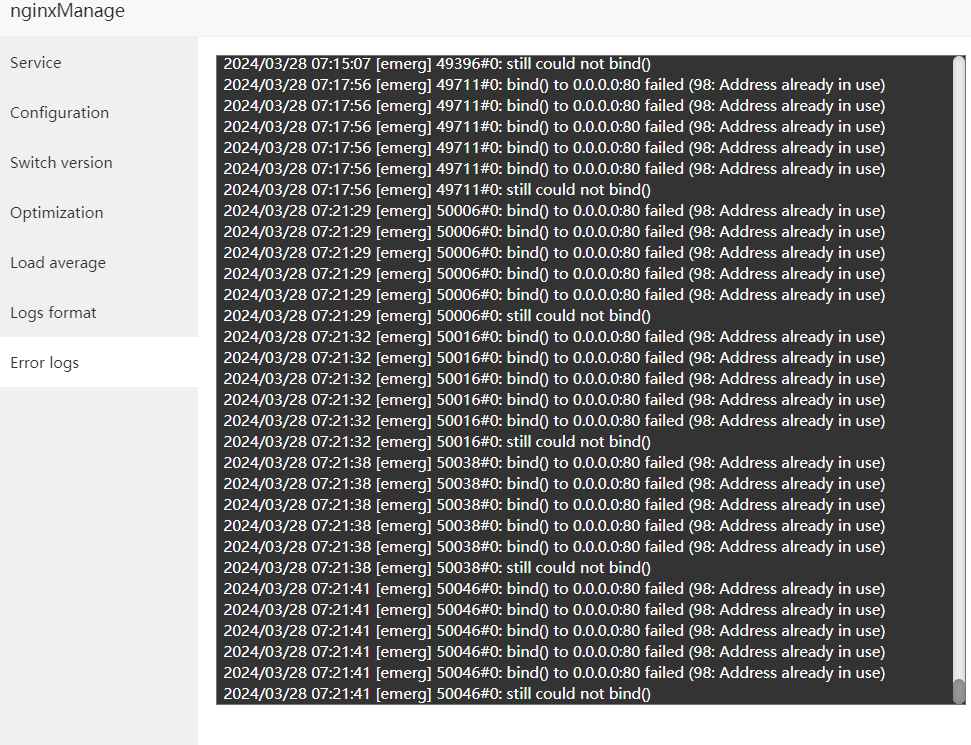 aaPanel_Kern It is recommended that you check what openresty is installed. Programs using the same port cannot run at the same time. ps aux|grep nginx