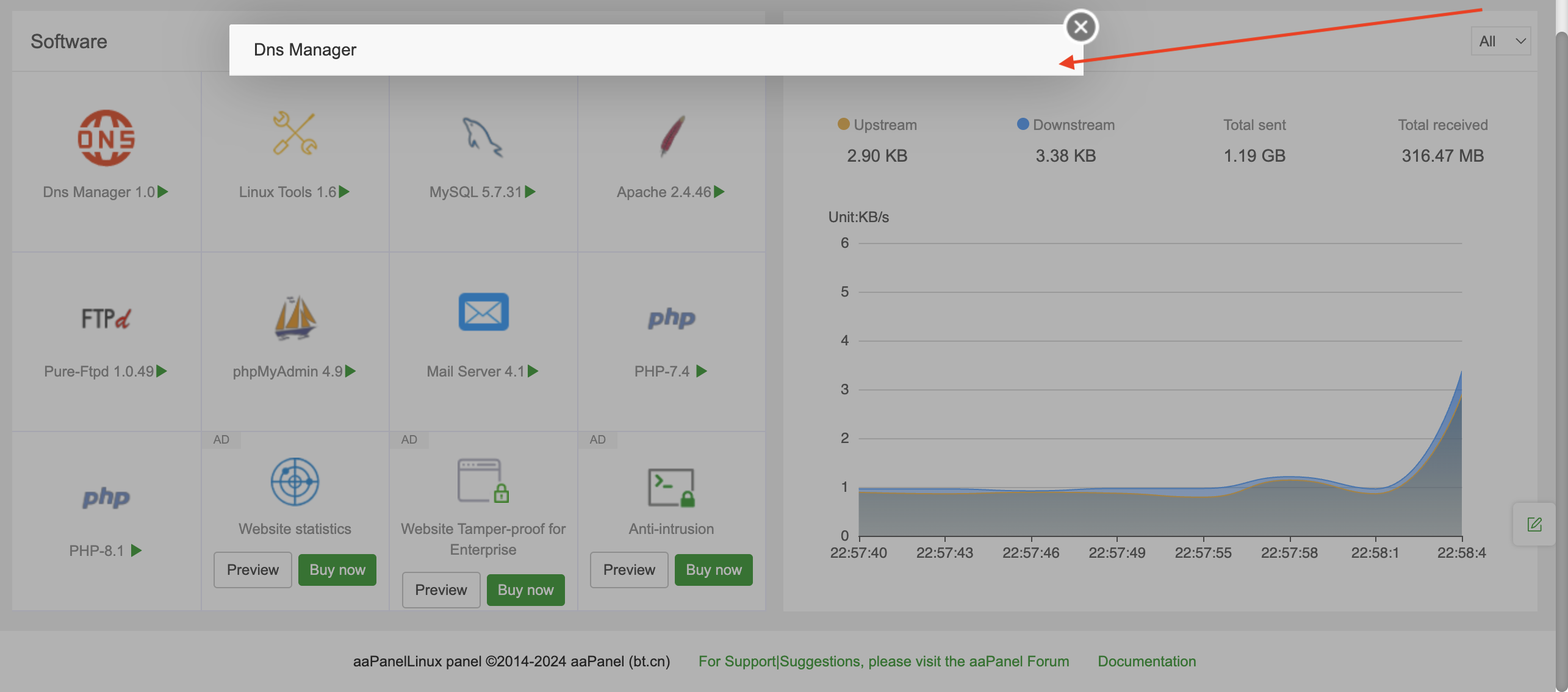 The DNS Manager is not showing up in my aaPanel. I don't know what the issue is. I have already updated aaPanel to the latest version, 6.8.36. I have also restarted the server and updated the DNS manager app, but I still can't open the DNS Manager.