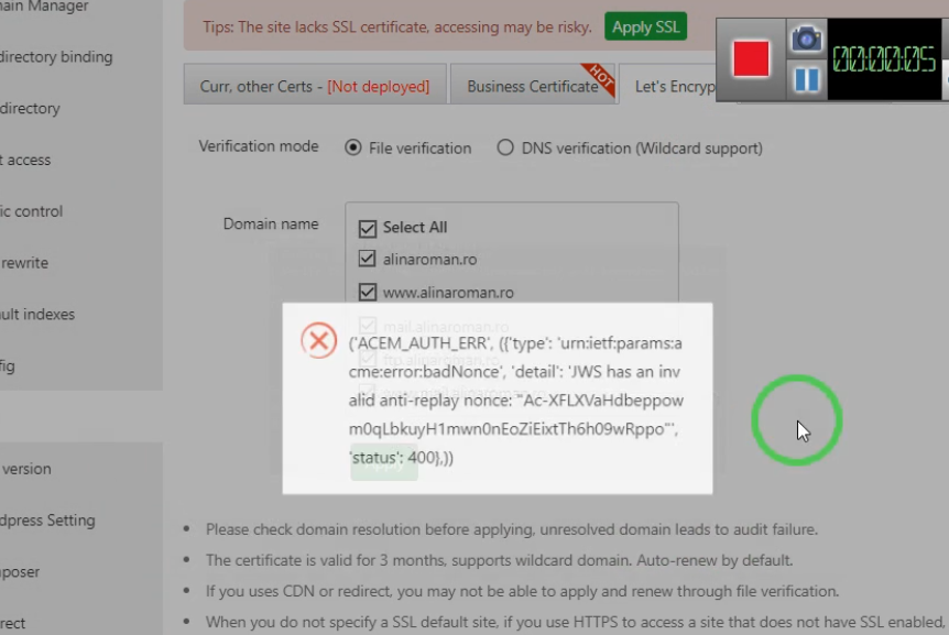 Hi Kern, I have not delete the configuration, after I have pushed the buttons many times for the SSL, the site was back online with new SSL, for an hour or 2 the ssl was dead and not generate.