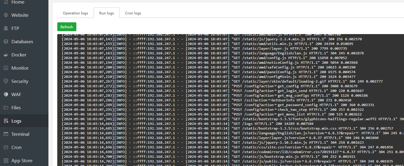 [pid: 2667|app: 0|req: 894/894] 127.0.0.1 () {32 vars in 449 bytes} [Mon May 6 06:48:35 2024] GET /config > generated 3754 bytes in 643 msecs (HTTP/1.1 200) 3 headers in 106 bytes (1 switches on core 0)