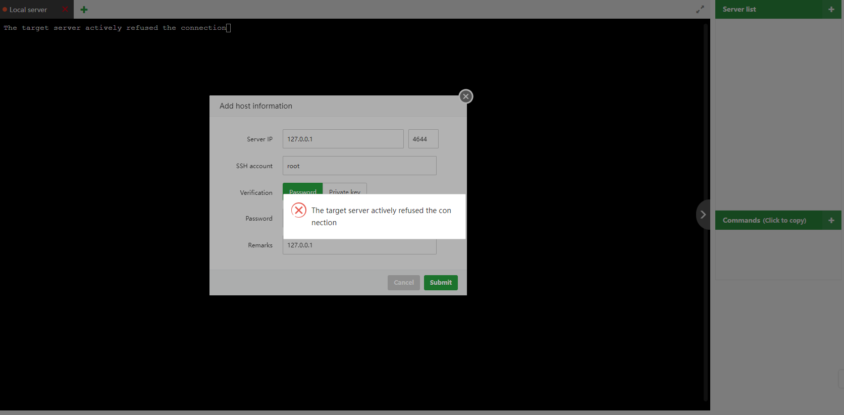 alperensah Hello, Thank you for your response. Actually, yes, there is no problem. Writing 127.0.0.1 was just an example, when I write the server ip address and when I write localhost I get the same error.