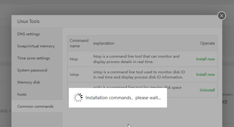 I tried to install htop and iotop from the Linux Tools 2.2's Common commands tab, but it sticks to the install animation. Since htop was already installed from outside of aaPanel (sudo dnf install htop), I tried both keeping it and removing it (sudo dnf remove htop), but it doesn't change the aaPanel's plugin behavior.