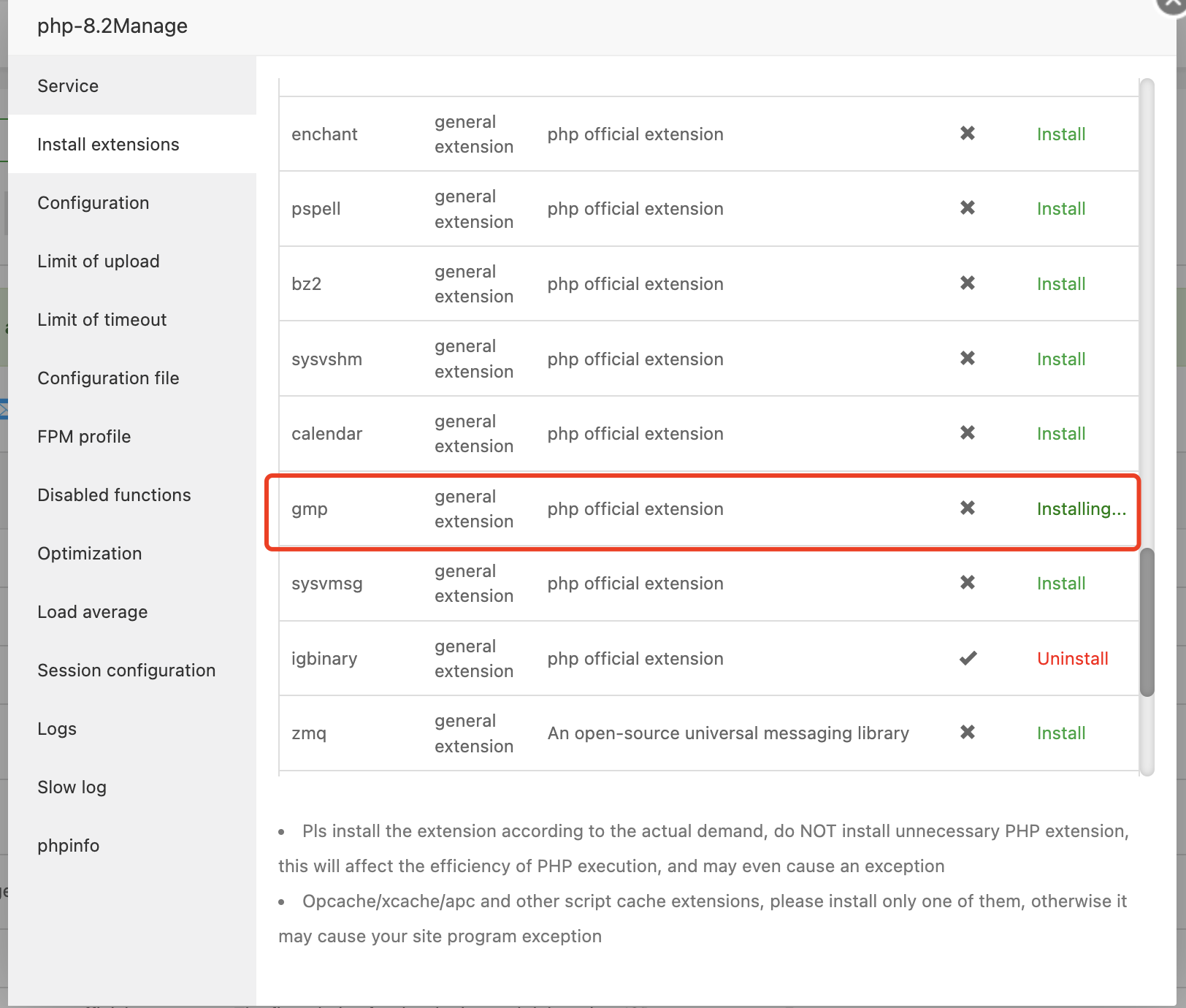 Aap_Sidney I am trying to install gmp extension but it is failing. I restarted the panel but it is the same. This extension cannot be installed. Please help!