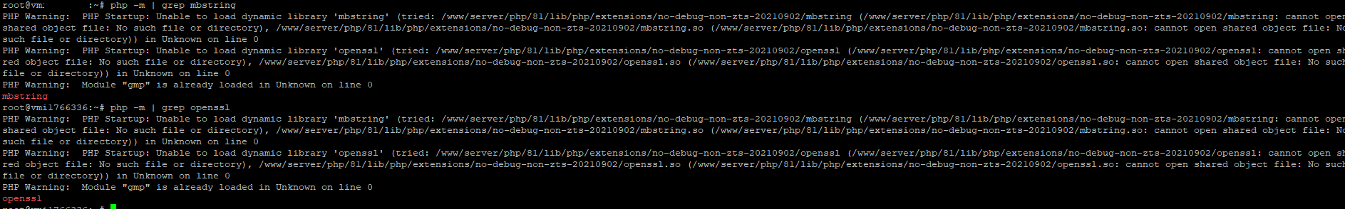 PHP Warning: PHP Startup: Unable to load dynamic library 'mbstring' (tried: /www/server/php/81/lib/php/extensions/no-debug-non-zts-20210902/mbstring (/www/server/php/81/lib/php/extensions/no-debug-non-zts-20210902/mbstring: cannot open shared object file: No such file or directory), /www/server/php/81/lib/php/extensions/no-debug-non-zts-20210902/mbstring.so (/www/server/php/81/lib/php/extensions/no-debug-non-zts-20210902/mbstring.so: cannot open shared object file: No such file or directory)) in Unknown on line 0