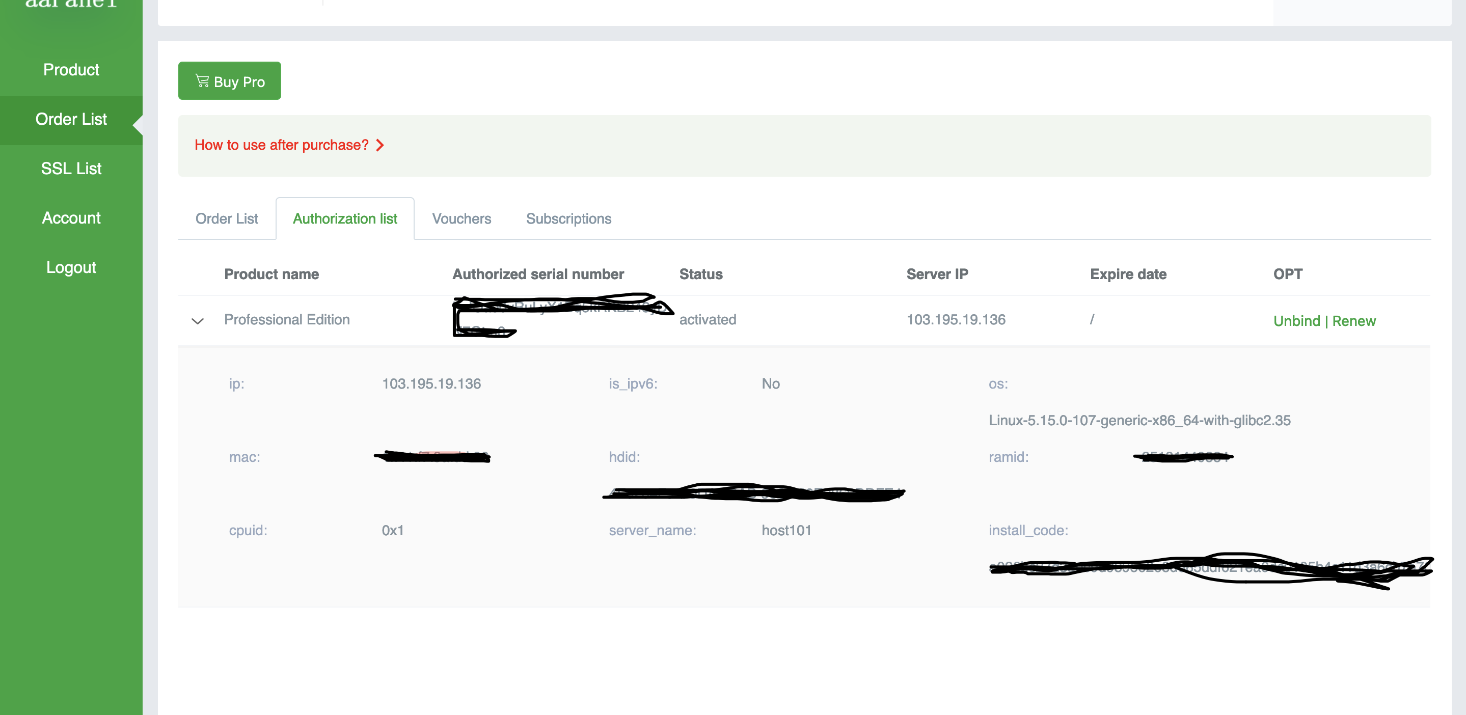 Hello, I bought the Aapanel Pro product but my server had a little problem which required me to reinstall it, after I reinstalled my Proxmox server, I reinstalled Aapanel with the same account but my pro account didn't appear, then I went to https:/ /www.aapanel.com/user_admin/order_list in the Authorization list section I found my pro account was still left there, can you help me to change it to aapanel on my new server? i want to replace my authorization ip