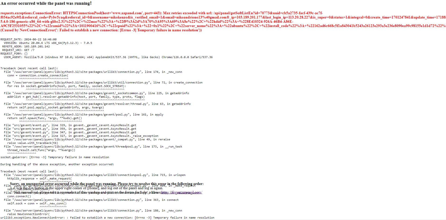urllib3.exceptions.MaxRetryError: HTTPSConnectionPool(host='www.aapanel.com', port=443): Max retries exceeded with url: /api/panel/getSoftListEn?id=70773&uuid=cb5a2735-facf-439c-ac7f-f034ac92e9f1&referral_code=Pylw5yaq&referral_id=0&username=nikokenzo&is_verified_email=1&email=nikoandriono13%40gmail.com®ip=103.189.201.177&last_login_ip=113.20.28.227&is_super=0&status=1&integral=0&create_time=1701247841&update_time=1718855413&email_verified_time=1701247861&resource_code=&token=eyJ0eXAiOiJKV1QiLCJhbGciOiJIUzI1NiJ9.eyJpcEFkZHJlc3MiOiIxMTMuMjAuMjguMjI3IiwiaXNzIjoiaHR0cHM6XC9cL3d3dy5hYXBhbmVsLmNvbVwvYXBpXC91c2VyXC9sb2dpbiIsImlhdCI6MTcxODg1NTQxMywibmJmIjoxNzE4ODU1NDEzLCJqdGkiOiI4czI5M3NnbU9pN3ZpaW5XIiwic3ViIjo3MDc3MywicHJ2IjoiMjNiZDVjODk0OWY2MDBhZGIzOWU3MDFjNDAwODcyZGI3YTU5NzZmNyJ9.ritpMQ9osmkuGsosN7J1RgJtfXPRKmm15DudAhbYZPQ&uid=70773&server_id=162ad6c668c5f1a843041b5243a26123e293a3e236e8090ea99c98155e1d1d72&environment_info=%7B%22ip%22%3A+%22113.20.28.227%22%2C+%22is_ipv6%22%3A+0%2C+%22os%22%3A+%22Linux-5.4.0-186-generic-x86_64-with-glibc2.31%22%2C+%22mac%22%3A+%22f9%3A2d%3A70%3A95%3A69%3A8e%22%2C+%22hdid%22%3A+%228E410324-926A-46B4-A86E-A9C5F2531055%22%2C+%22ramid%22%3A+1011900416%2C+%22cpuid%22%3A+%22+0x1%22%2C+%22server_name%22%3A+%22ubuntu%22%2C+%22install_code%22%3A+%22162ad6c668c5f1a843041b5243a26123e293a3e236e8090ea99c98155e1d1d72%22%7D (Caused by NewConnectionError(': Failed to establish a new connection: [Errno -3] Temporary failure in name resolution'))
