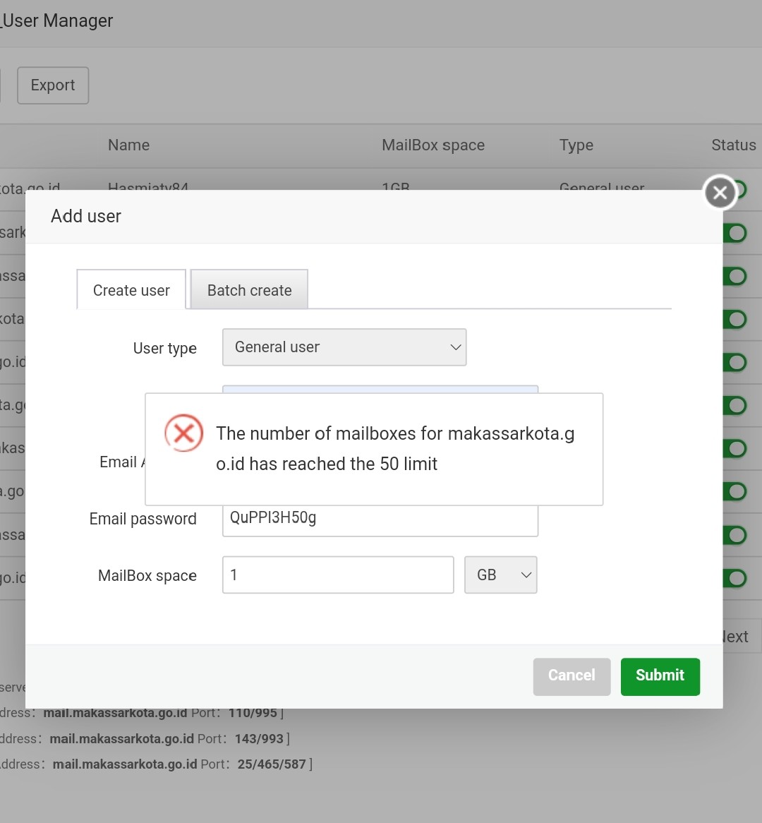 aaPanel_Kern kominfodevict Hello, please upgrade to 7.0.7 and upgrade the mail server to 5.0.4 or higher. Then go to the Mail Server menu to edit the relevant fields and modify Mailboxes. Is this a solution?