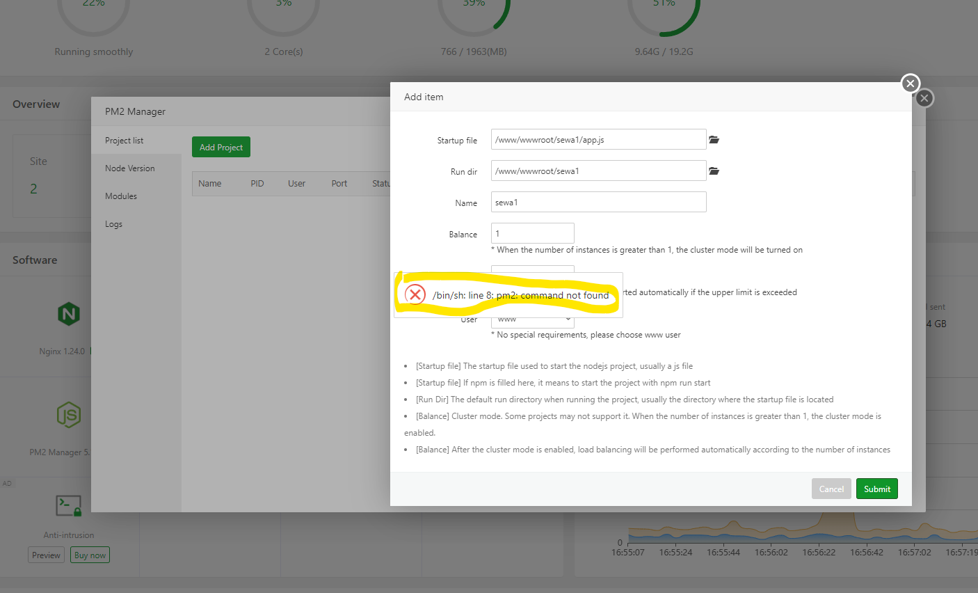 aaP_sabitsurga yesterday, my PM2 Manager still has a project, the following is a screenshot why is everything gone today? please help me everything is gone, and I try to add the project in PM2 Manager, but it shows this error: help me to fix it admin