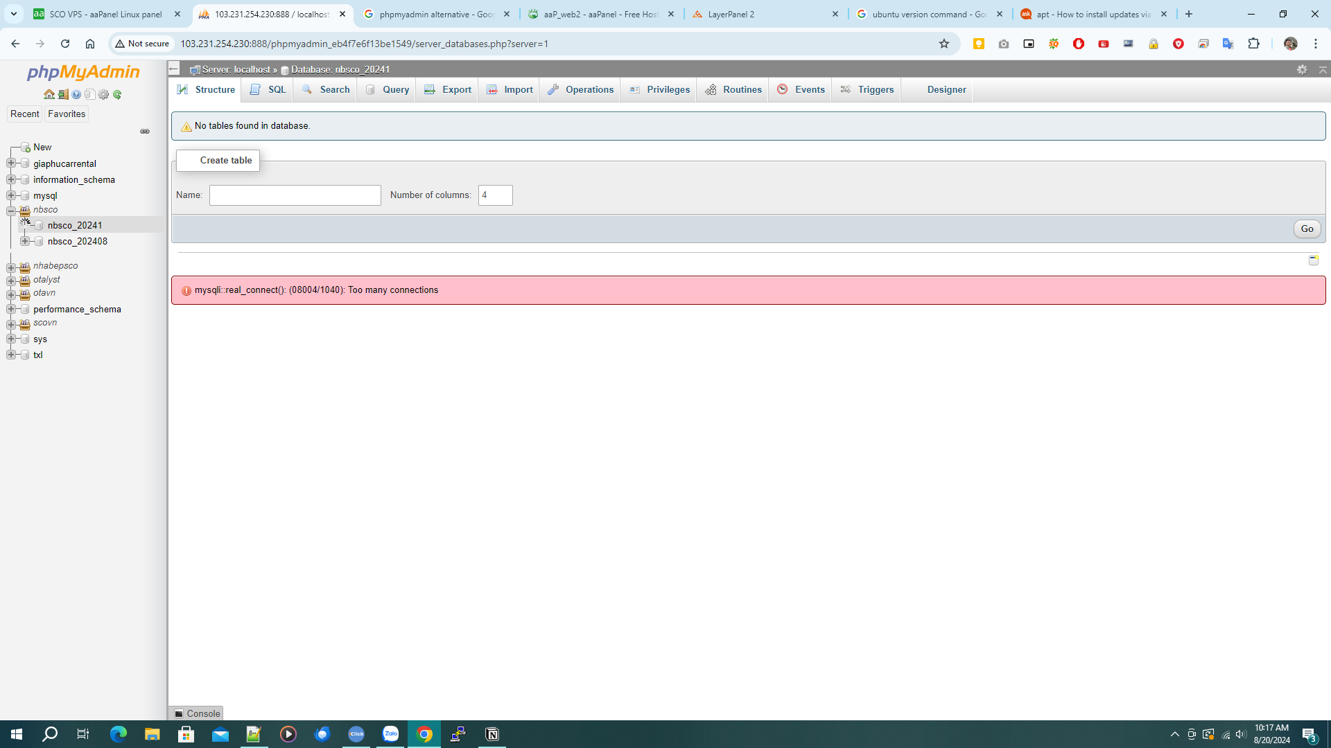 aaP_demo1 aaPanel_Kern I think it means that his databases had already exceed max connection limit. Increasing max connection value at MySQL Server is needed.