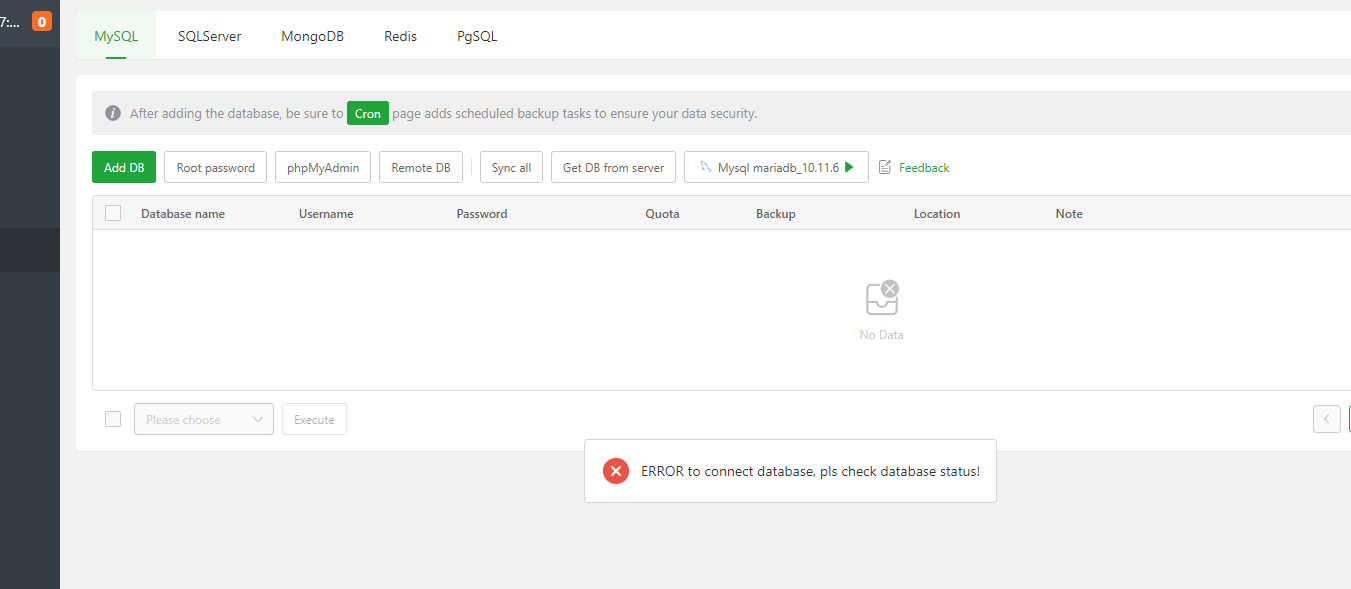 When I try to create a new database ( or do anything with the databases) I see an error: "ERROR to connect database, pls check database status!"