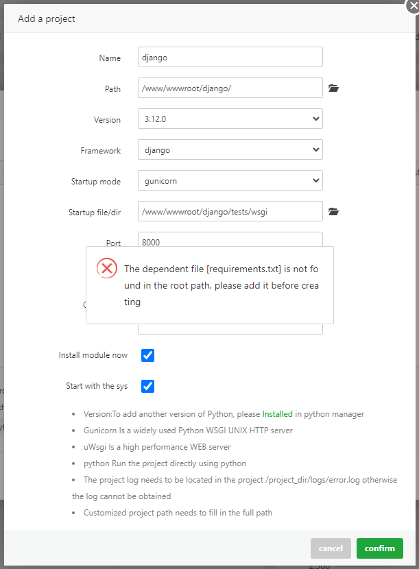 I have referred to the article about installing DjangoBlog and tried but failed to deploy a clean django version. I was notified by aapanel that the "requirements.txt" file could not be found.
