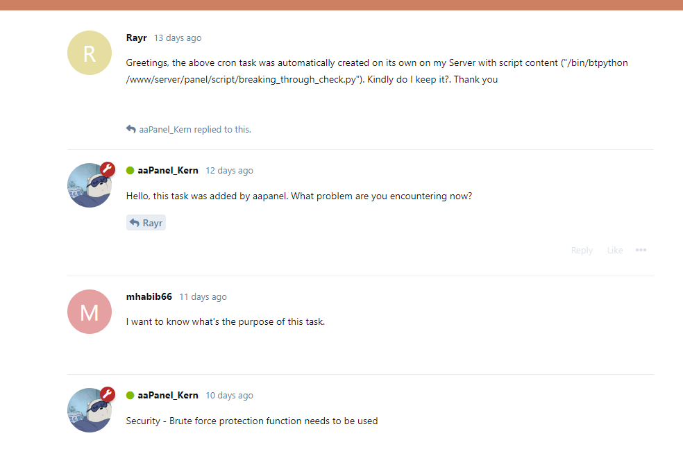 I hope everyone is doing well. I'm a big fan of AApanel, but unfortunately, the latest update has caused significant issues for my business. After 5-6 days of research, I discovered that these problems started after updating to the new version. Today, I installed AApanel on a new server, and it automatically added a cron job and a script that runs in an infinite loop. I've already shared the script link and the GitHub repository.