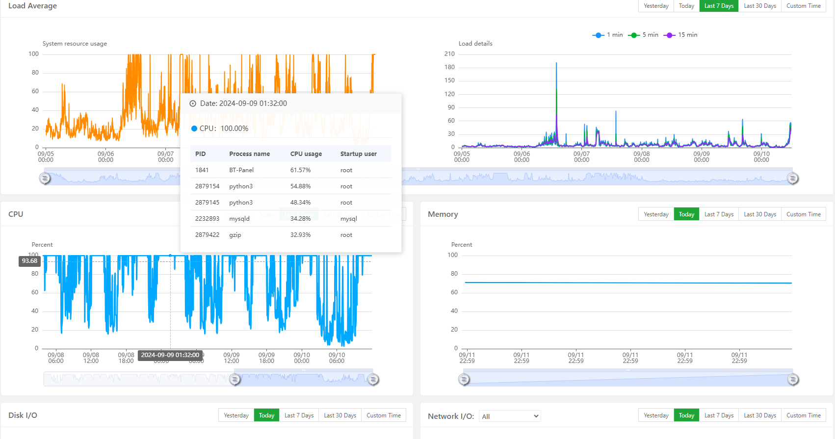 In the last 10 days, I've noticed that the CPU usage is too high. Sometimes it appears to exceed 100%, showing values like 120% or 200%. I don't actually know why this is happening, but when I check the System Monitor page, I see that most of the time, BT-Panel is consuming much of the resources.