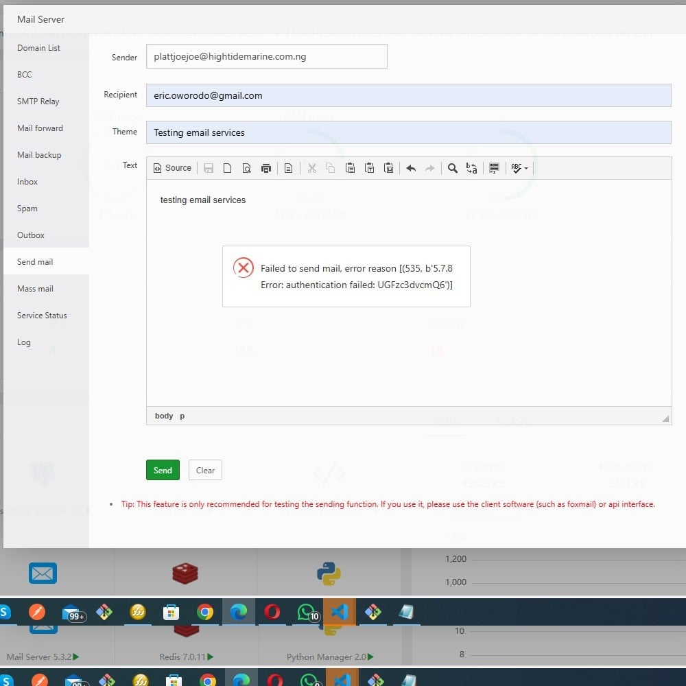 Hello, check your website configuration. If the website and mail server are on the same server, it is recommended to use the intranet address or 127.0.0.1 port 25, and turn off SMTP security.