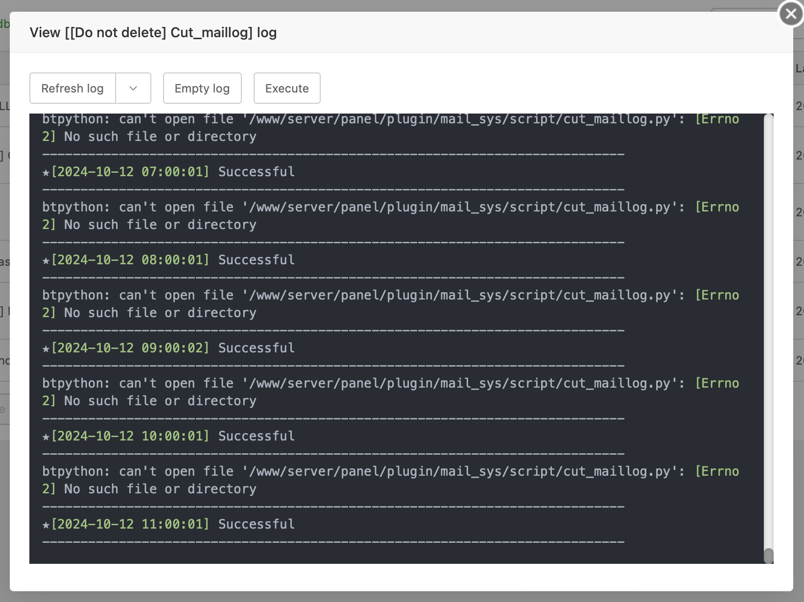 7ender Hey there! why it happens(what for) and where I can download this file? btpython: can't open file '/www/server/panel/plugin/mail_sys/script/cut_maillog.py': [Errno 2] No such file or directory