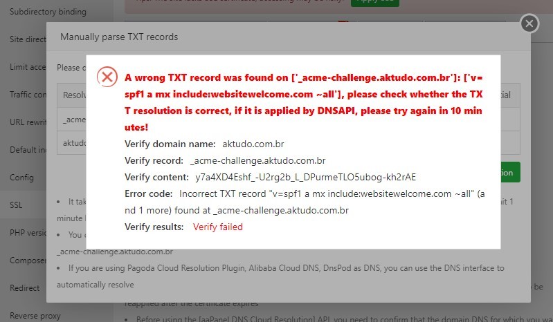 aaPanel_Kern Hello, please check if the TXT record is added as required? After adding, you need to wait for a while before it takes effect. Finally, return to the interface for manually adding txt records and verify the dns records. aaP_aktudovendas