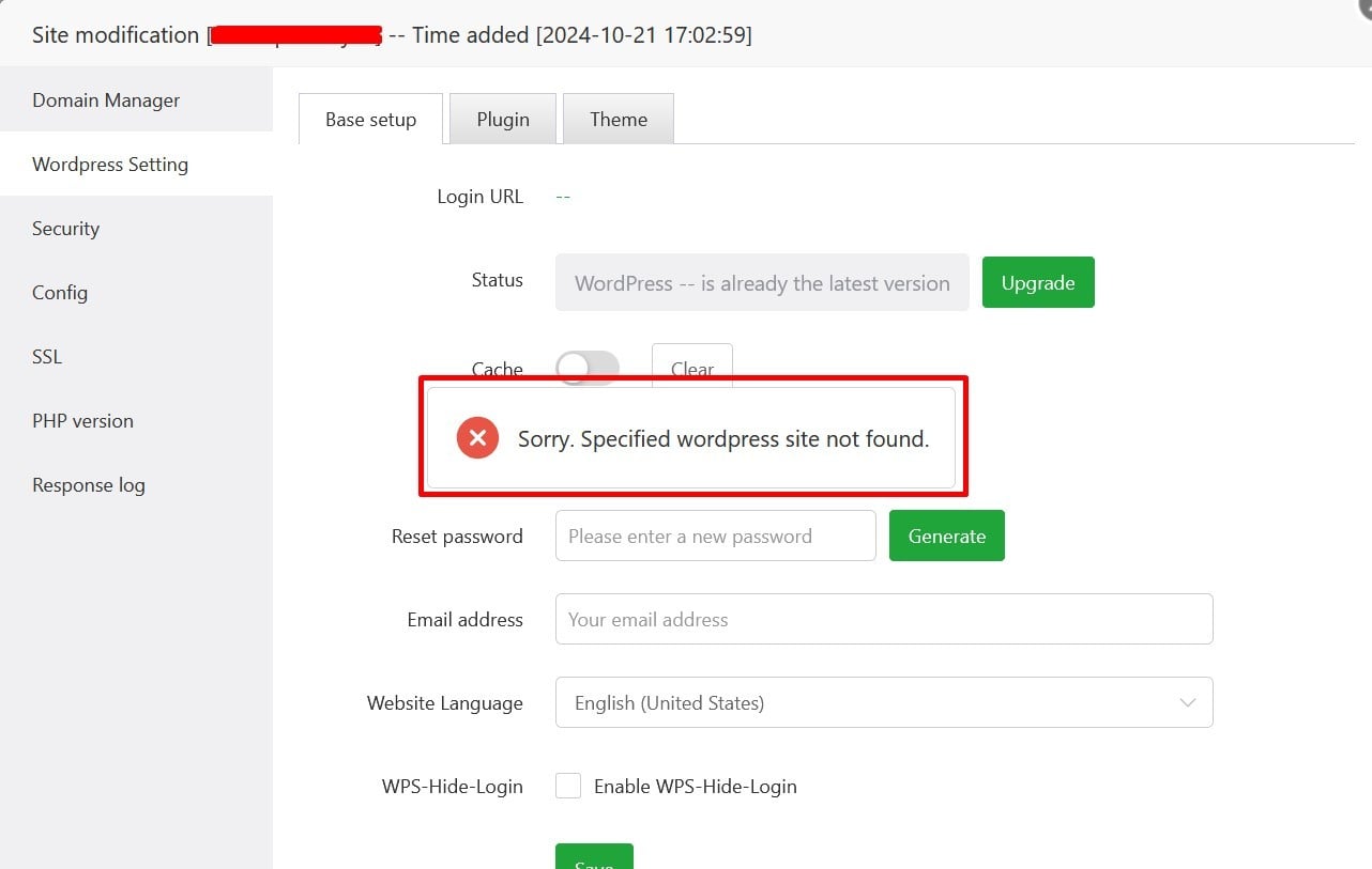 I encountered an error on the panel saying that my WordPress website could not be found. This happened after I created a new WordPress site using WP-Toolkit with an initial password, for example: abcd. Then, I imported content from my old website, including its database, which replaced the original wp-admin user (abcd) with 1234 from the old website. As a result, the panel no longer recognizes my new site that was imported from the old one.