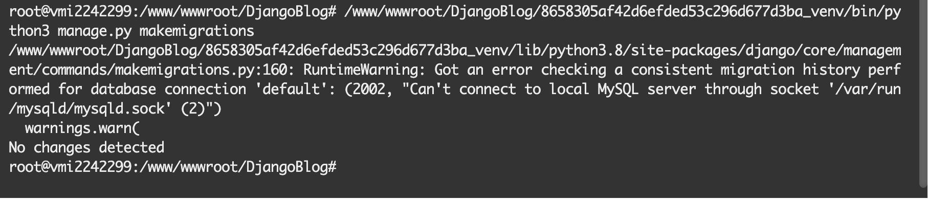 aaP_mrpk8882 6.Start performing data migration Generate data: /www/wwwroot/DjangoBlog/8658305af42d6efded53c296d677d3ba_venv/bin/python3 manage.py makemigrations /www/wwwroot/DjangoBlog/8658305af42d6efded53c296d677d3ba_venv/bin/python3 manage.py migrate after Run make migration file getting this type error my SQL already install