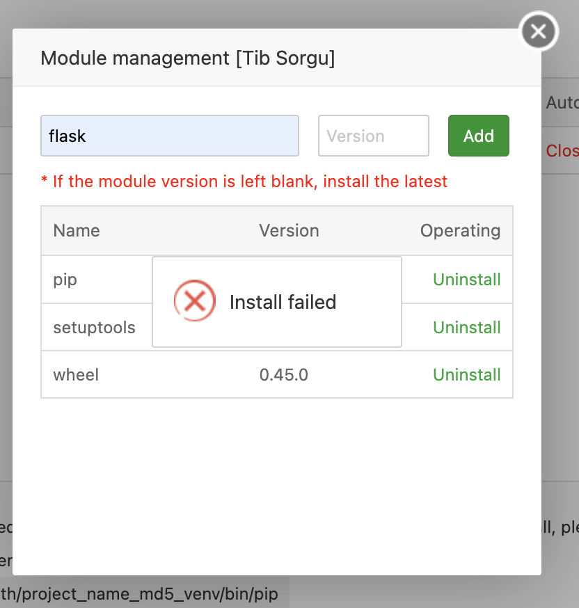 aaPanel_Kern Hello, would you like to try using the command line to install the module? project_directory/pip install Flask ByEzel
