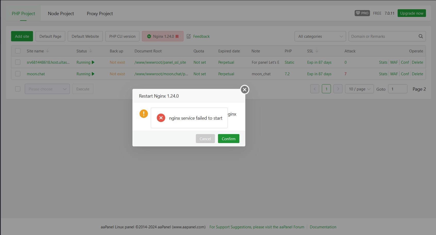 aaPanel_Kern Hello, have you installed nginx free firewall? If so, please use nginx 1.22 and below. krrish