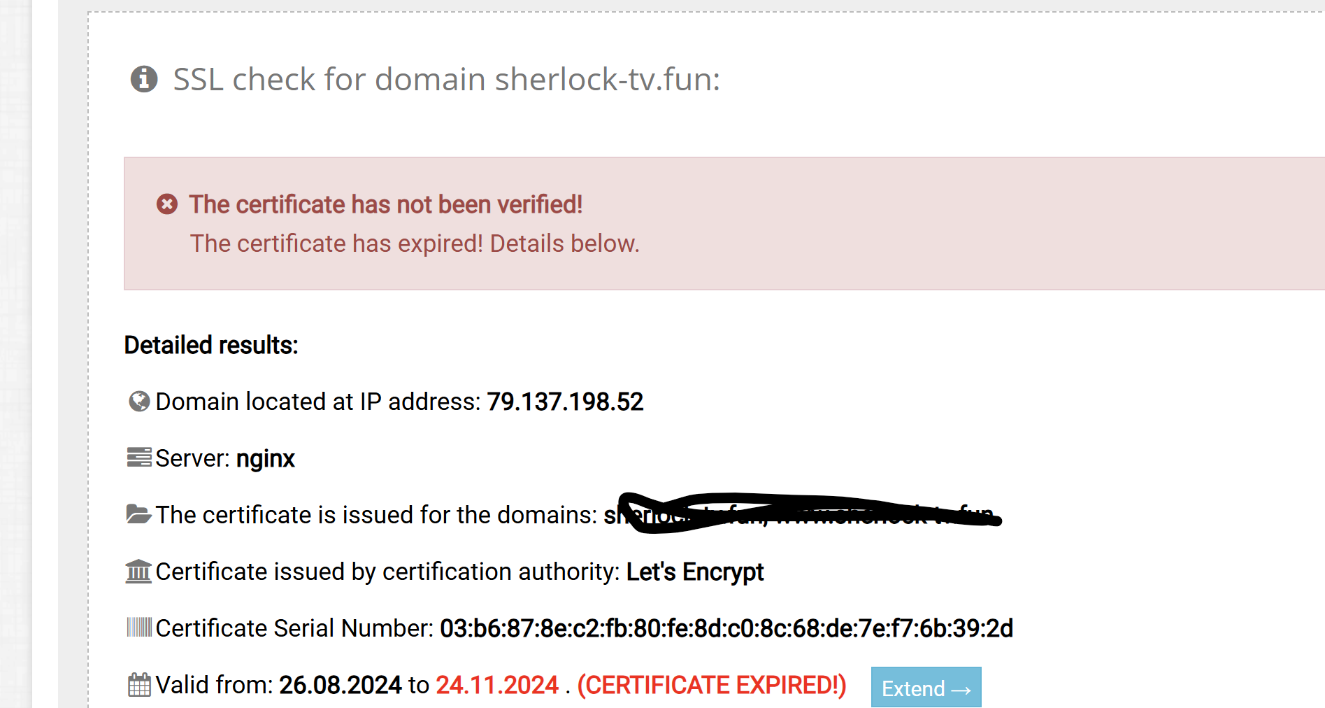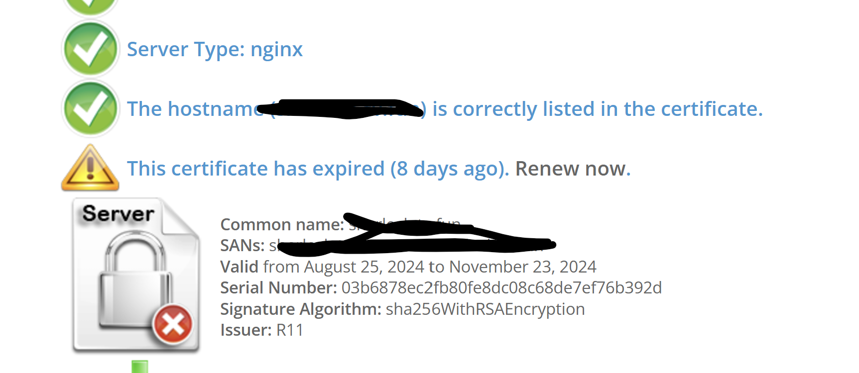 PronHouse Hello, after the ssl certificate expired, I can't update it. I clicked reissue ssl through the aapanel and the aapanel shows that it has been updated, but the site starts with an error and in different services, the ssl check shows that the ssl certificate has expired and is not installed. What should I do and how do I install the ssl certificate?