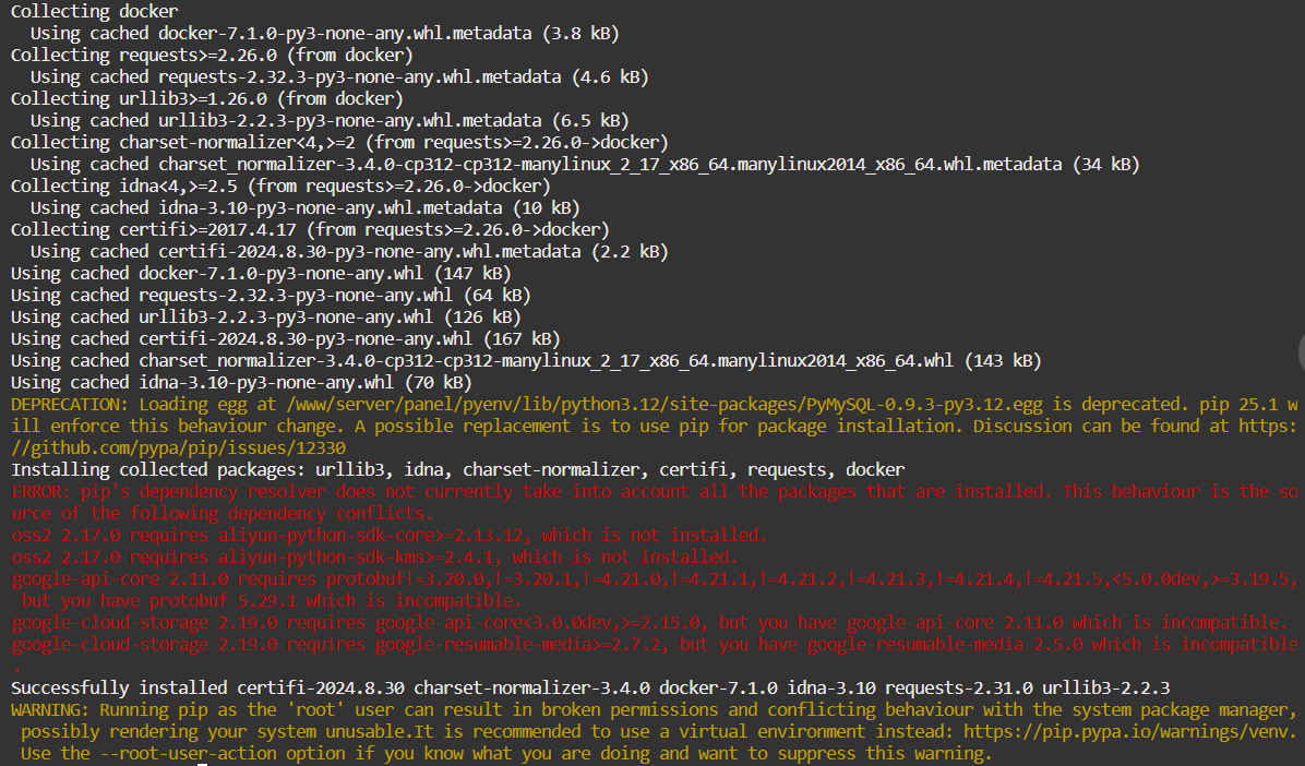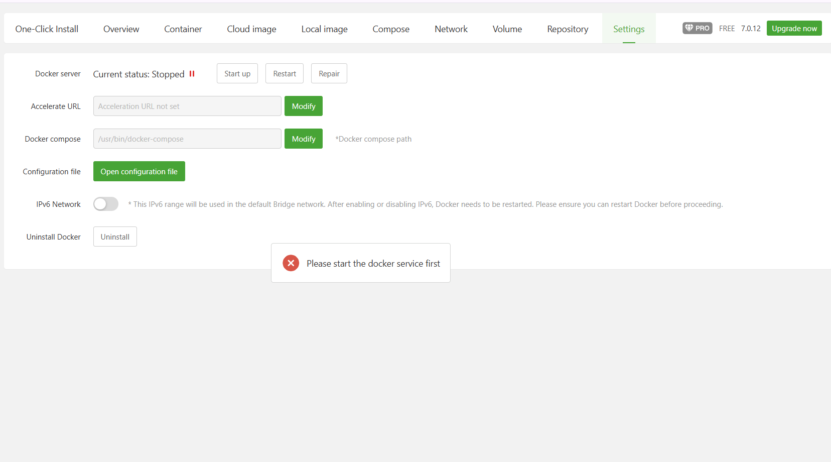 I have this fresh install of aaPanel, used Docker module to install n8n, and everything was working. But suddenly at some point, when I enter on the Docker tab I receive this message saying "Please start the docker service first". If i click on "Start up" or "Restart" buttons, it says "docker has been started succesfully", but when I go to any of the tabs the Docker panel, I get the same message. I uninstalled and re-installed Docker, triend everything I found on internet, updated, re-intaled it manually on the terminal... But nothing seems to fix this problem.