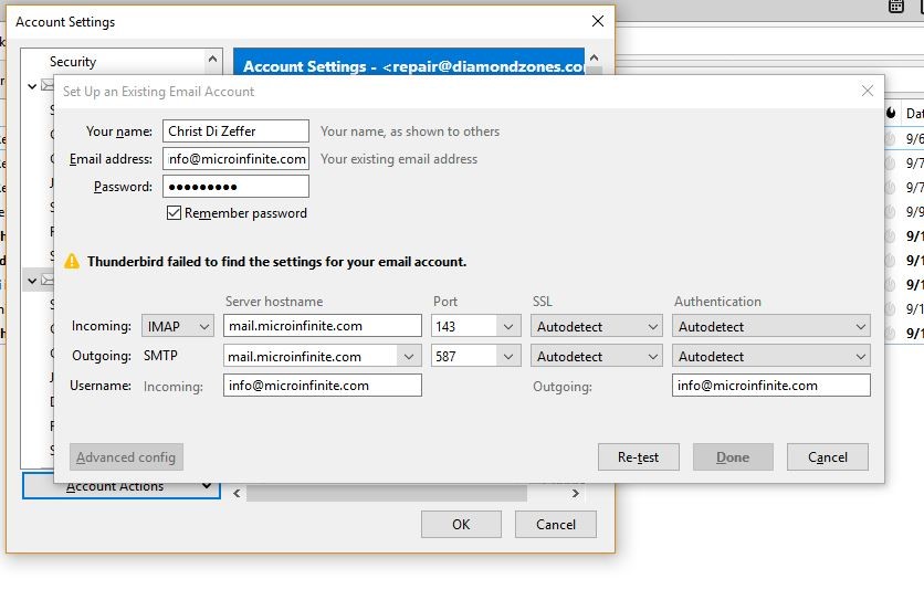 when i configuring it to Thunderbird IMAP/POP3 with ports. (its says Thunderbird failed to find the setting of your email account) . (Screen Shot Attached)