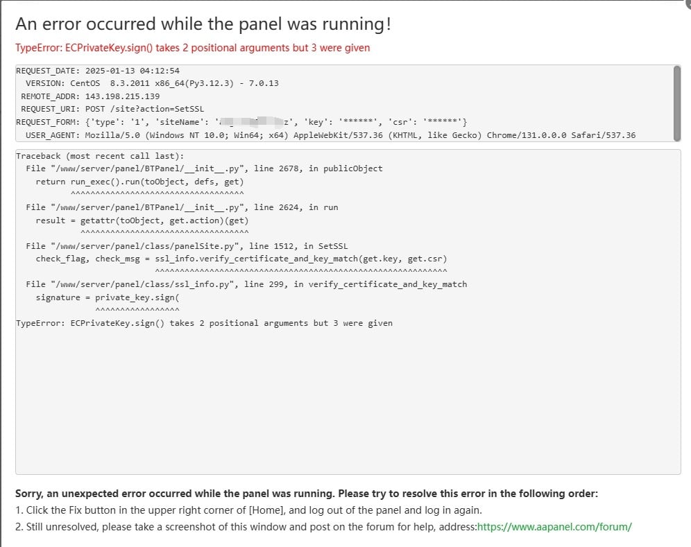 File "/www/server/panel/class/panelSite.py", line 1512, in SetSSL